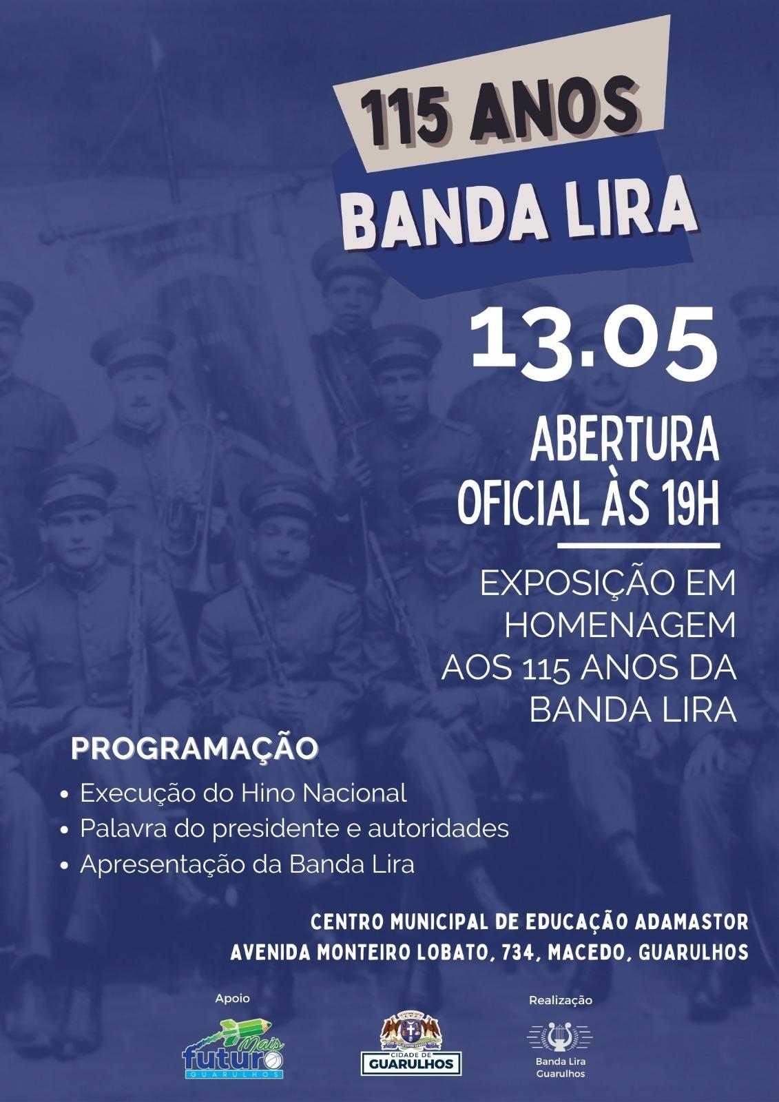 Entre os dias 13 e 31 de maio, das 9h às 22h, o espaço expositivo do Centro Municipal de Educação Adamastor recebe exposição em homenagem aos 115 anos da Banda Lira de Guarulhos, grupo formado em 15 de maio de 1908 e considerado patrimônio histórico da cidade. A abertura da exposição, no dia neste sábado (13), às 19h, conta com apresentação da banda. A entrada é gratuita e a classificação, livre.