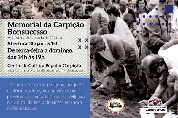 Textos, imagens e elementos complementares significativos como maquete, oratório e adereços da Festa de Nossa Senhora do Bonsucesso e da Festa da Carpição compõem a exposição Memorial da Carpição. A mostra, em exibição permanente no Centro de Cultura Popular Carpição a partir do dia 30 de janeiro, de terça-feira a domingo, das 14h às 19h, tem como objetivo propagar informações históricas dessa tradição. A entrada é gratuita e a classificação, livre.