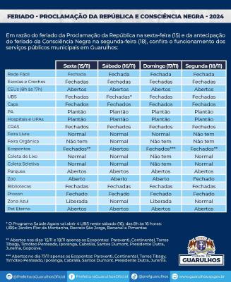 Em razão do feriado da Proclamação da República na sexta-feira (15) e da antecipação do feriado da Consciência Negra na segunda-feira (18), confira,ao lado e abaixo, o funcionamento dos serviços públicos municipais em Guarulhos:
