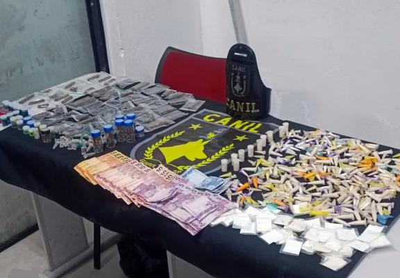 Agentes do Canil da Guarda Civil Municipal (GCM) de Guarulhos prenderam na noite desta quinta-feira (18) um homem por tráfico de entorpecentes na rua Clarice Lispector, Jardim Munira, após o acusado assustar-se com o patrulhamento da equipe e tentar fugir. Ele possuía 298 reais em dinheiro no momento da averiguação, mas com a ajuda dos cães policiais Thanos e Ventania foram localizadas uma sacola e uma pochete com 490 gramas de cocaína e 430 gramas de maconha em dois lugares próximos.