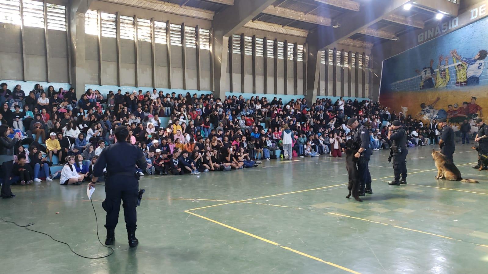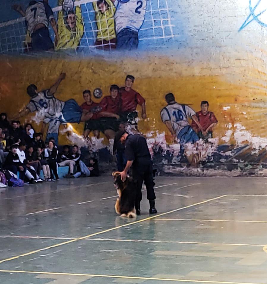 Os cães policiais Troia, Airon e Athos, da Guarda Civil Municipal (GCM) de Guarulhos, demonstraram suas habilidades a mais de 600 estudantes e professores da Escola Estadual Homero Rubens de Sá nesta quinta-feira (22). Guiados por seus treinadores, agentes de patrulhamento com cães, os animais obedeceram a comandos para buscar objetos por meio do faro e conter suspeitos em abordagens policiais. Demonstraram, ainda, a agilidade que possuem para perseguições.
