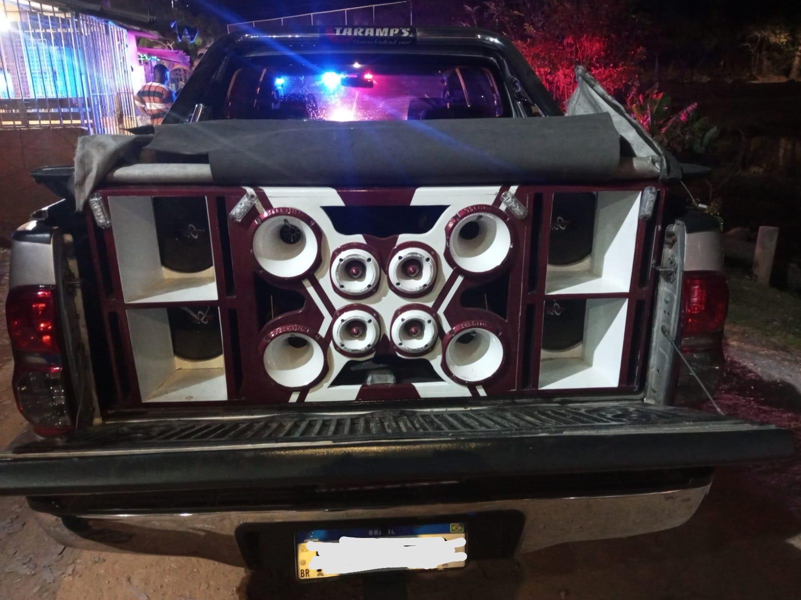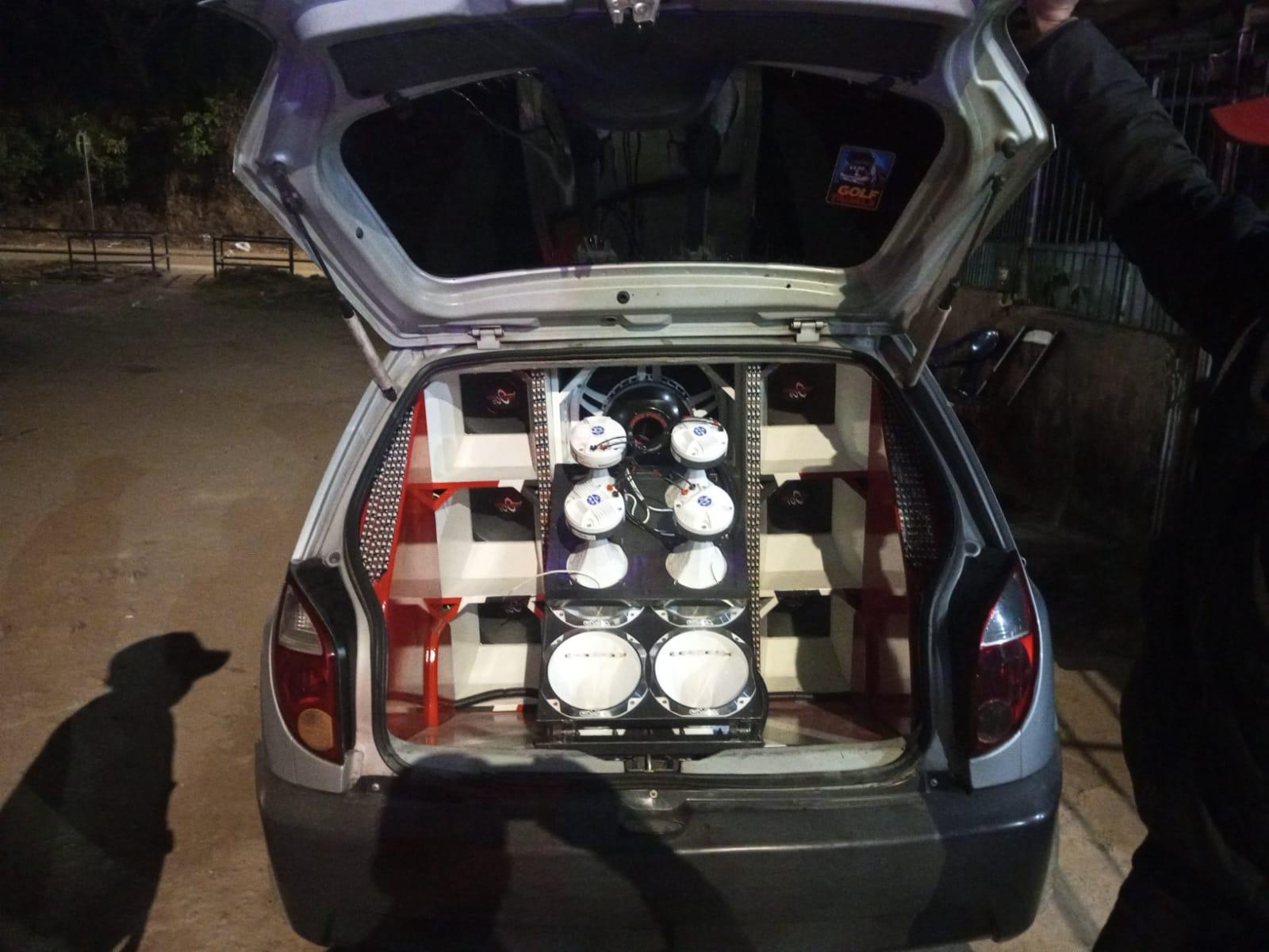 Durante patrulhamento preventivo na travessa Guanabara, a equipe flagrou dois veículos com caixas de som adulteradas emitindo barulho excessivo.