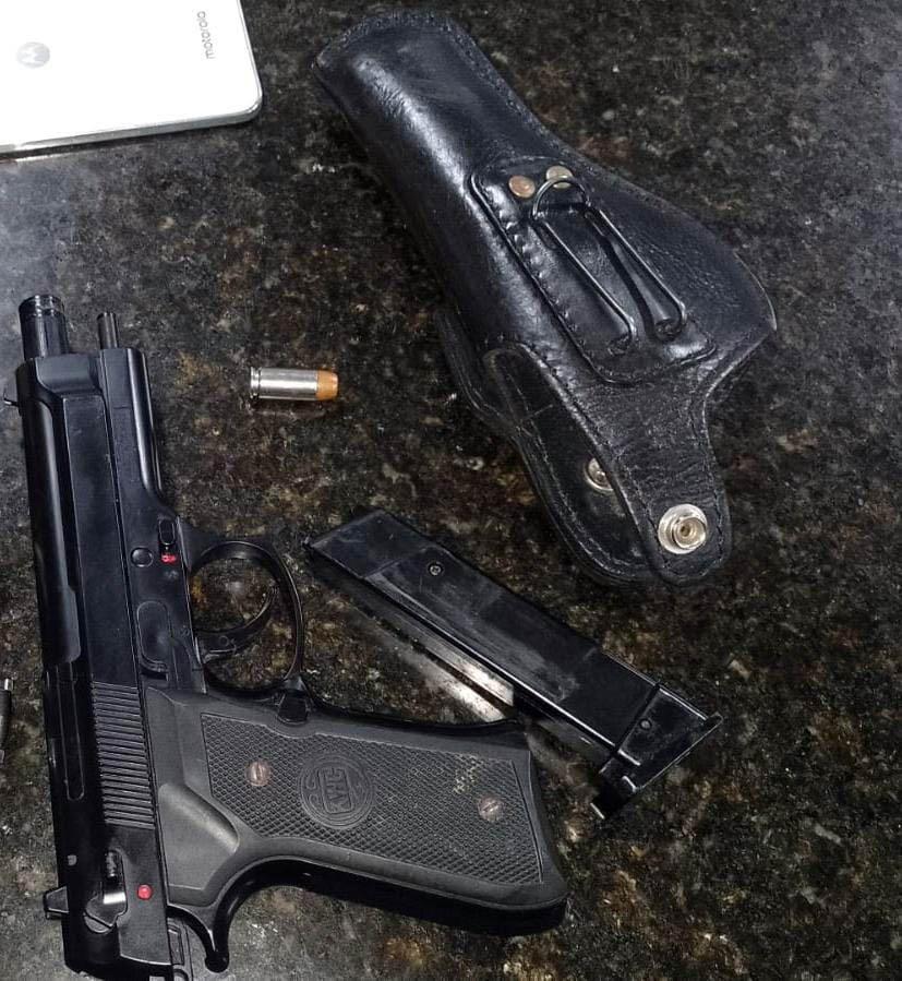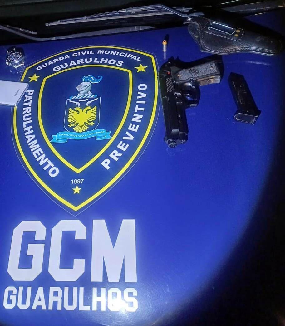 Agentes da Inspetoria Parques da Guarda Civil Municipal (GCM) de Guarulhos prenderam um homem foragido da Justiça na madrugada deste domingo (2) durante patrulhamento preventivo pela avenida Salgado Filho, altura do Jardim Santa Mena. A equipe decidiu pela averiguação do detido, que caminhava nas proximidades do Centro de Convivência do Idoso, unidade da Prefeitura. Com ele foi localizado um simulacro de arma de fogo e uma munição real de pistola calibre .40.