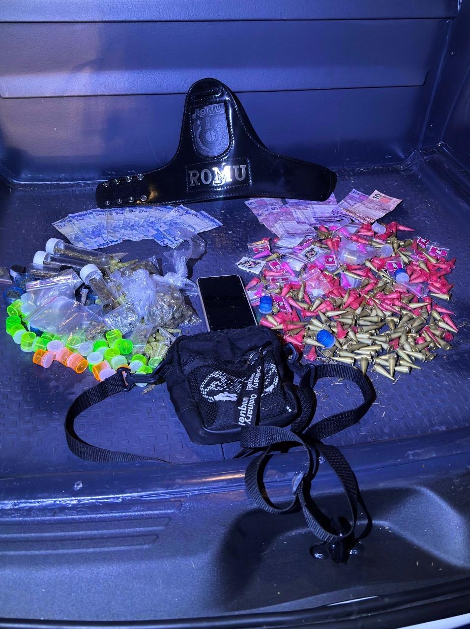 Durante patrulhamento preventivo pela avenida Francisco Russo, nas proximidades do campo de futebol, a equipe identificou um indivíduo em atitude suspeita. Na abordagem, os agentes encontraram com o suspeito uma sacola contendo 210 porções de cocaína e 129 porções de maconha, além de R$ 134 em dinheiro guardados em uma pochete.