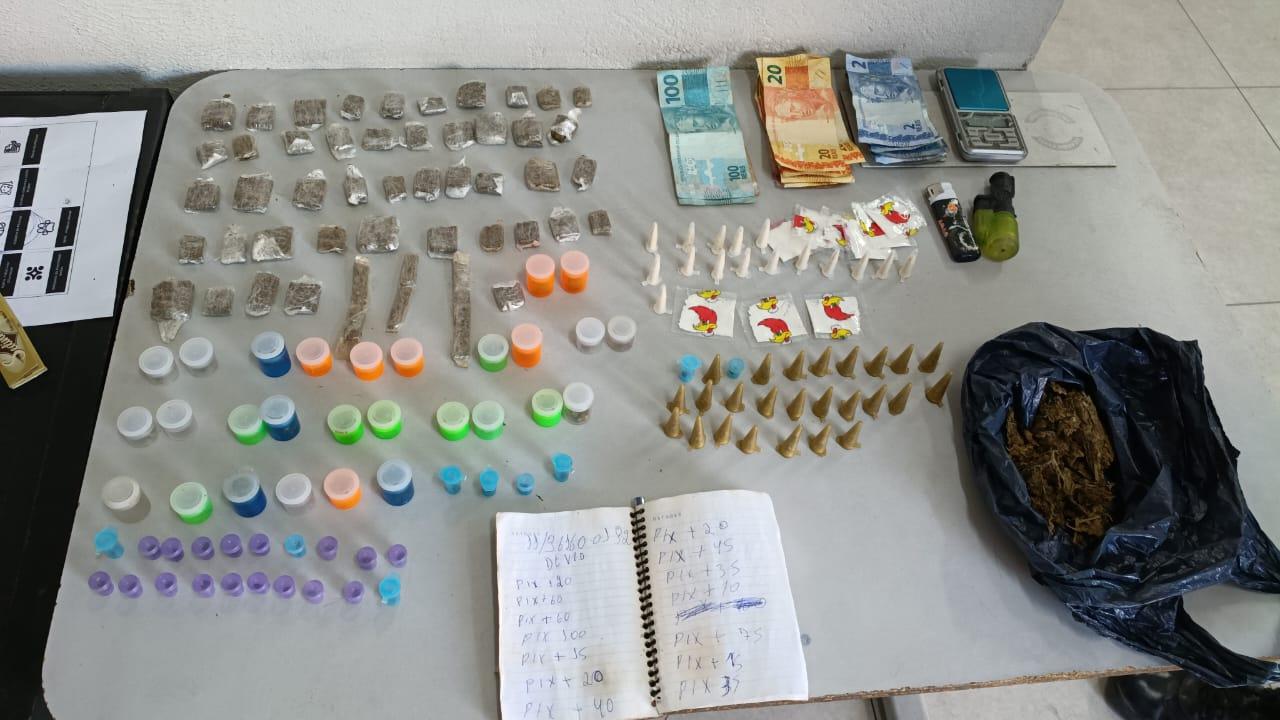 No bairro São João, agentes da Inspetoria Norte prenderam em flagrante dois criminosos que portavam 400 gramas de maconha e cocaína, além de R$ 477,00 em dinheiro, uma balança de precisão e um caderno com anotações sobre a contabilidade do crime.