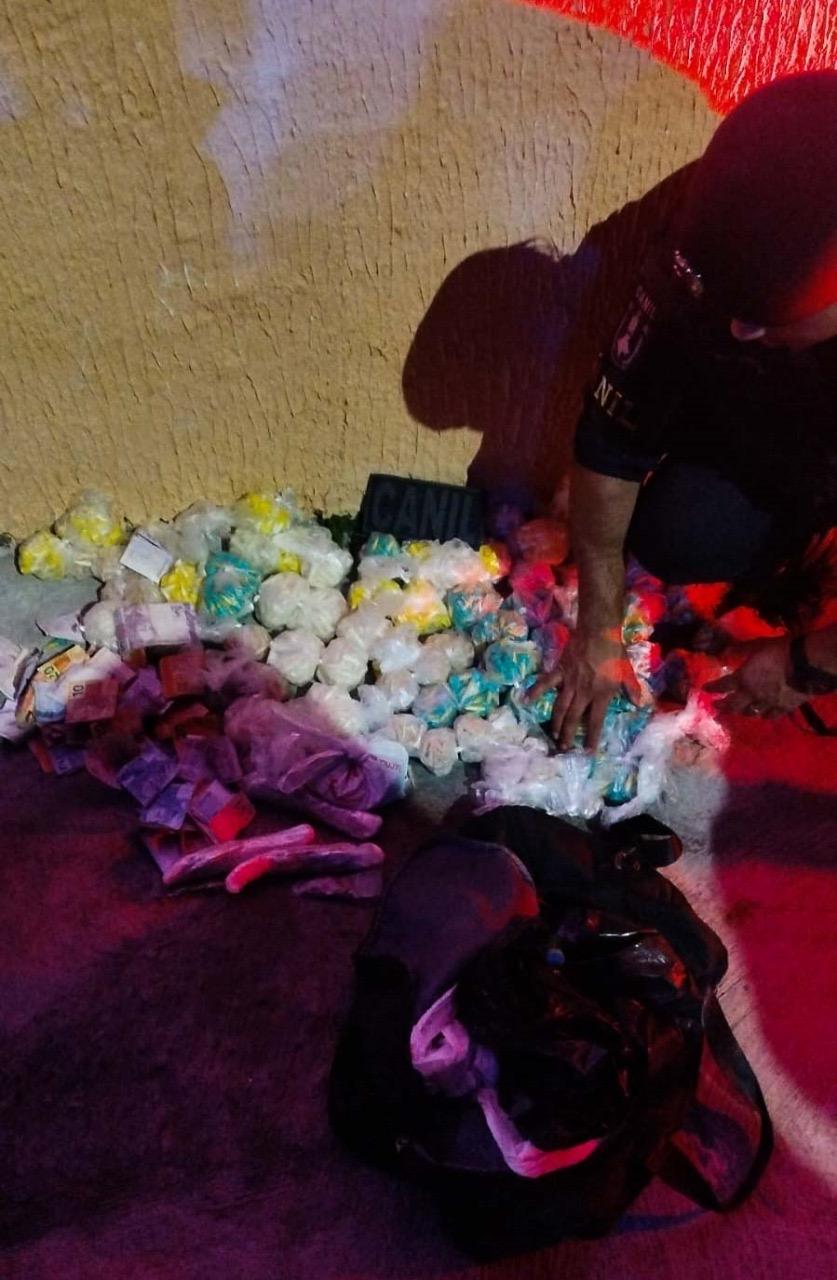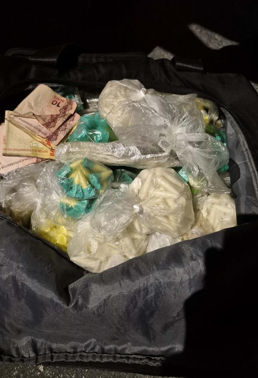Durante patrulhamento preventivo na rua Eusonia, os agentes abordaram um suspeito em posse de uma bolsa contendo 3.840 porções de cocaína e 110 porções de maconha, além de R$ 826,00 em dinheiro e um celular utilizado na atividade criminosa.