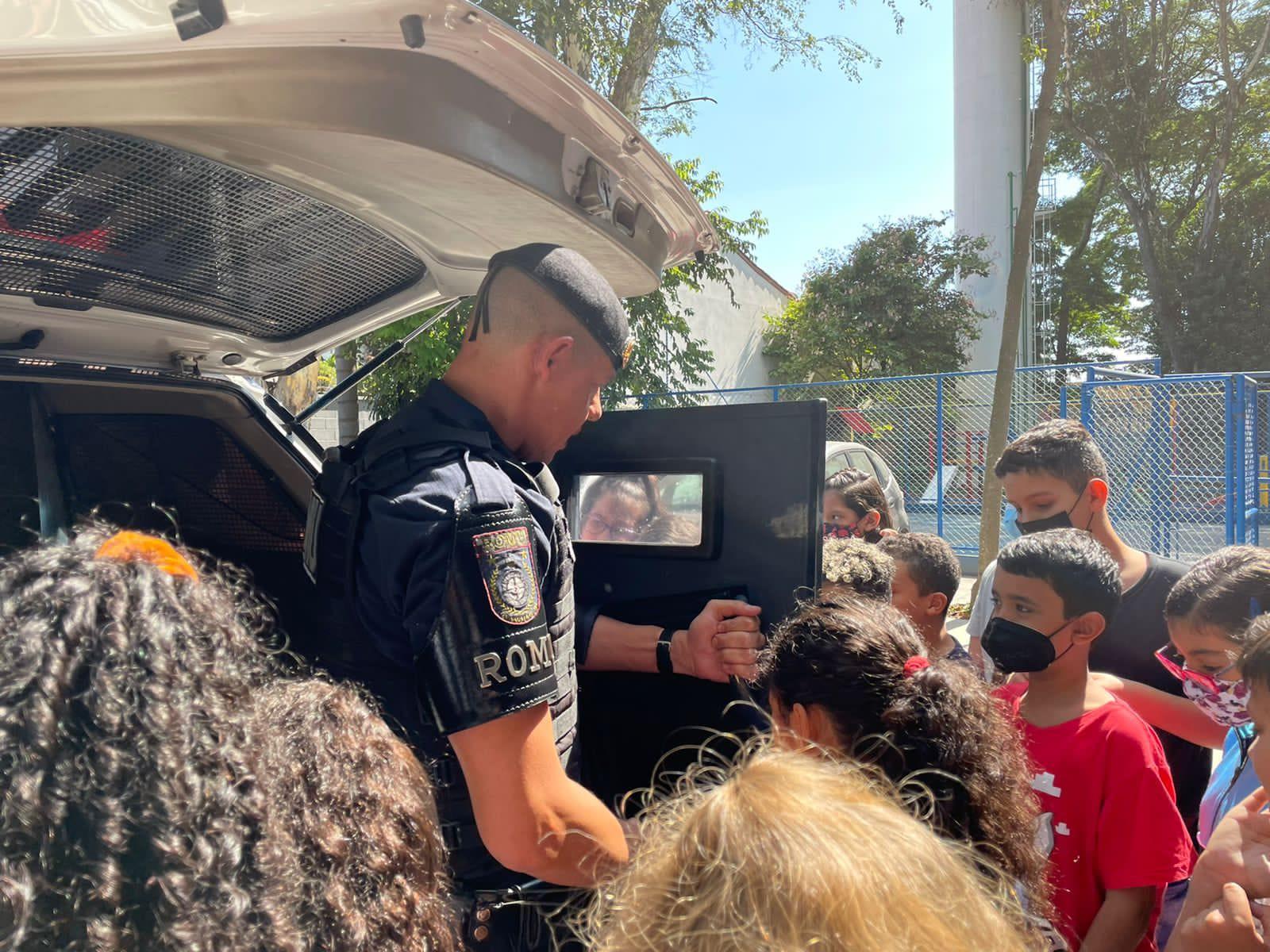 Os alunos participaram de palestras sobre o uso indevido das drogas e interagiram com agentes de patrulhamento tático, que apresentaram os equipamentos e os trabalhos preventivos.