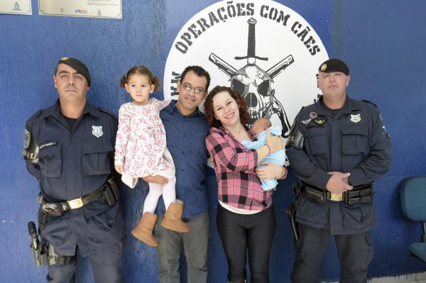 Na manhã desta sexta-feira (16) a Inspetoria de Patrulhamento com Cães (Canil) recebeu uma visita pra lá de especial. Estiveram no local o coordenador financeiro Adelmo Morfeu Guimarães, a esposa Marcelly, a filhinha Helena e o pequeno Gabriel, de apenas uma semana.