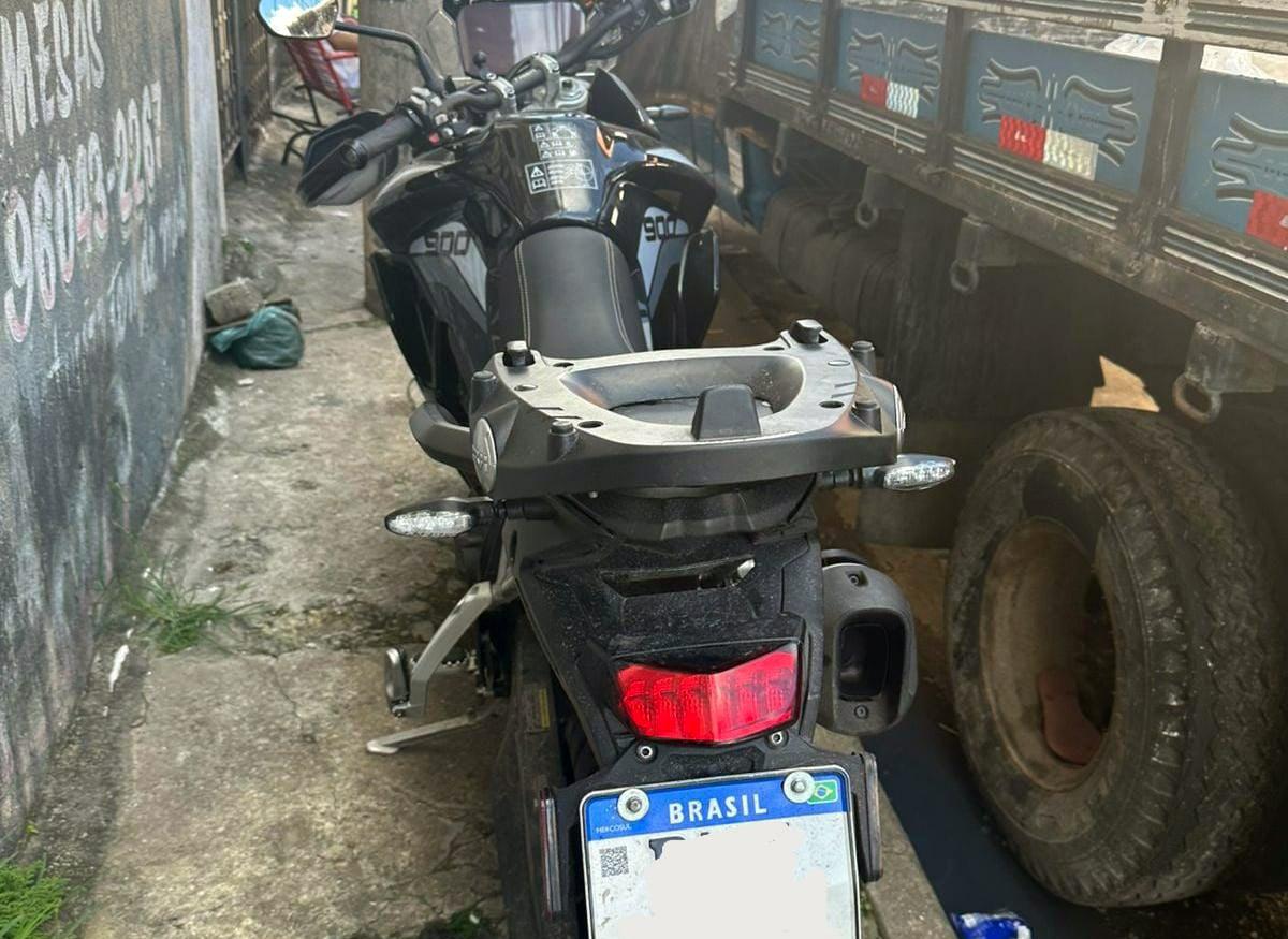Em seguida, na mesma via, os agentes desconfiaram de uma motocicleta Triumph Tiger 900GT preta, ano 2022, de Guarulhos, estacionada mais à frente sobre a calçada.  Em consulta pelo emplacamento ao sistema de informações criminais, o veículo apresentava denúncia de roubo na rodovia Presidente Dutra, altura de Bonsucesso, onde a vítima foi abordada por volta das 20h da sexta-feira (7), sendo ameaçada por dois elementos em outra motocicleta e o seu veículo subtraído sob violência.