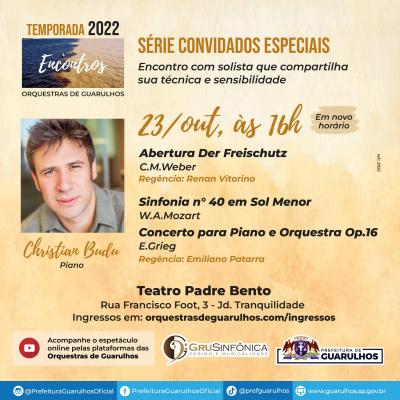 No próximo domingo (23), às 16h, a Orquestra Gru Sinfônica apresenta espetáculo da série Convidados Especiais de sua temporada e convida ao palco do Teatro Padre Bento, no Jardim Tranquilidade, o pianista Cristian Budu. Os ingressos gratuitos estão disponíveis para retirada no site http://orquestrasdeguarulhos.com/.