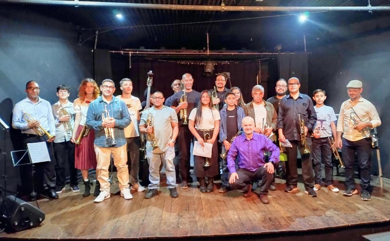 Cerca de 100 pessoas compareceram na noite de terça-feira (11) ao auditório da Biblioteca Monteiro Lobato para apreciar boa música no show do grupo trompete.com.br. Formado por alunos do Conservatório Municipal de Artes sob coordenação do professor Roberto Gastaldi, a apresentação levou mais de vinte estudantes ao palco.