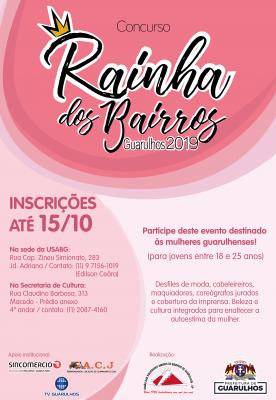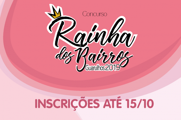 Até o dia 15 de outubro a Prefeitura de Guarulhos está com inscrições abertas para jovens entre 18 e 25 anos interessadas em participar do Concurso Rainha dos Bairros 2019, evento voltado para a descoberta de novos talentos nos bairros e comunidades. A iniciativa, realizada por meio da parceria entre a Secretaria de Cultura e a União das Sociedades Amigos de Bairro (USABG), tem como objetivo elevar a autoestima da mulher guarulhense. A participação é gratuita.