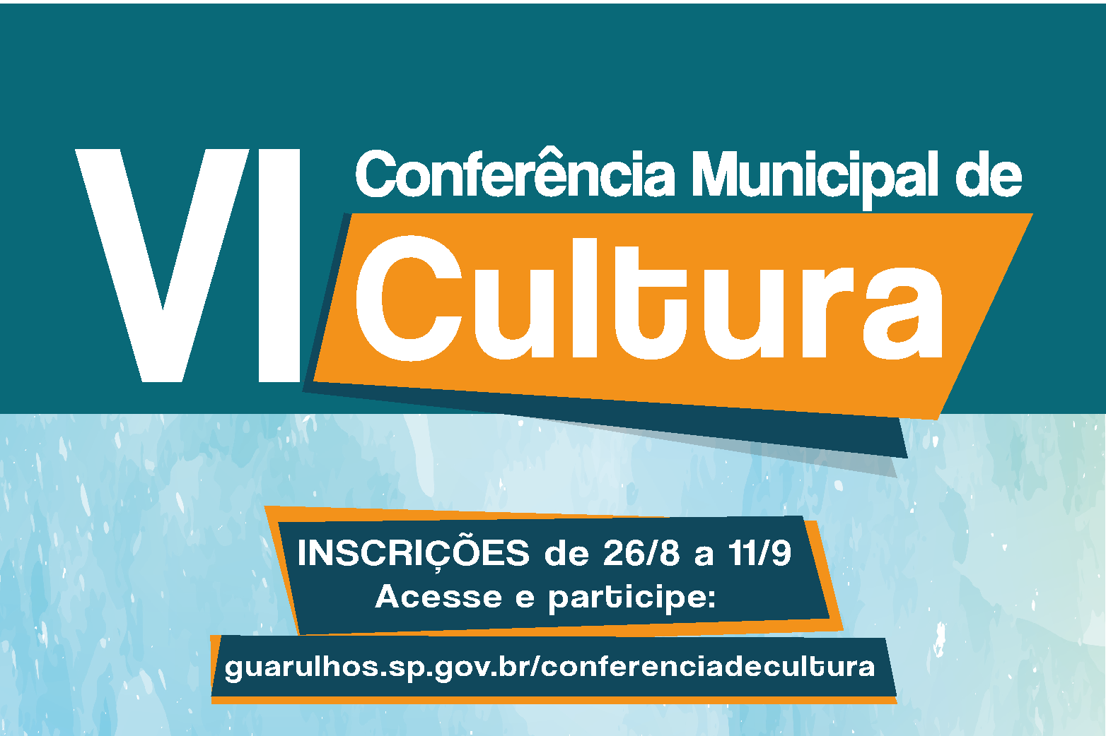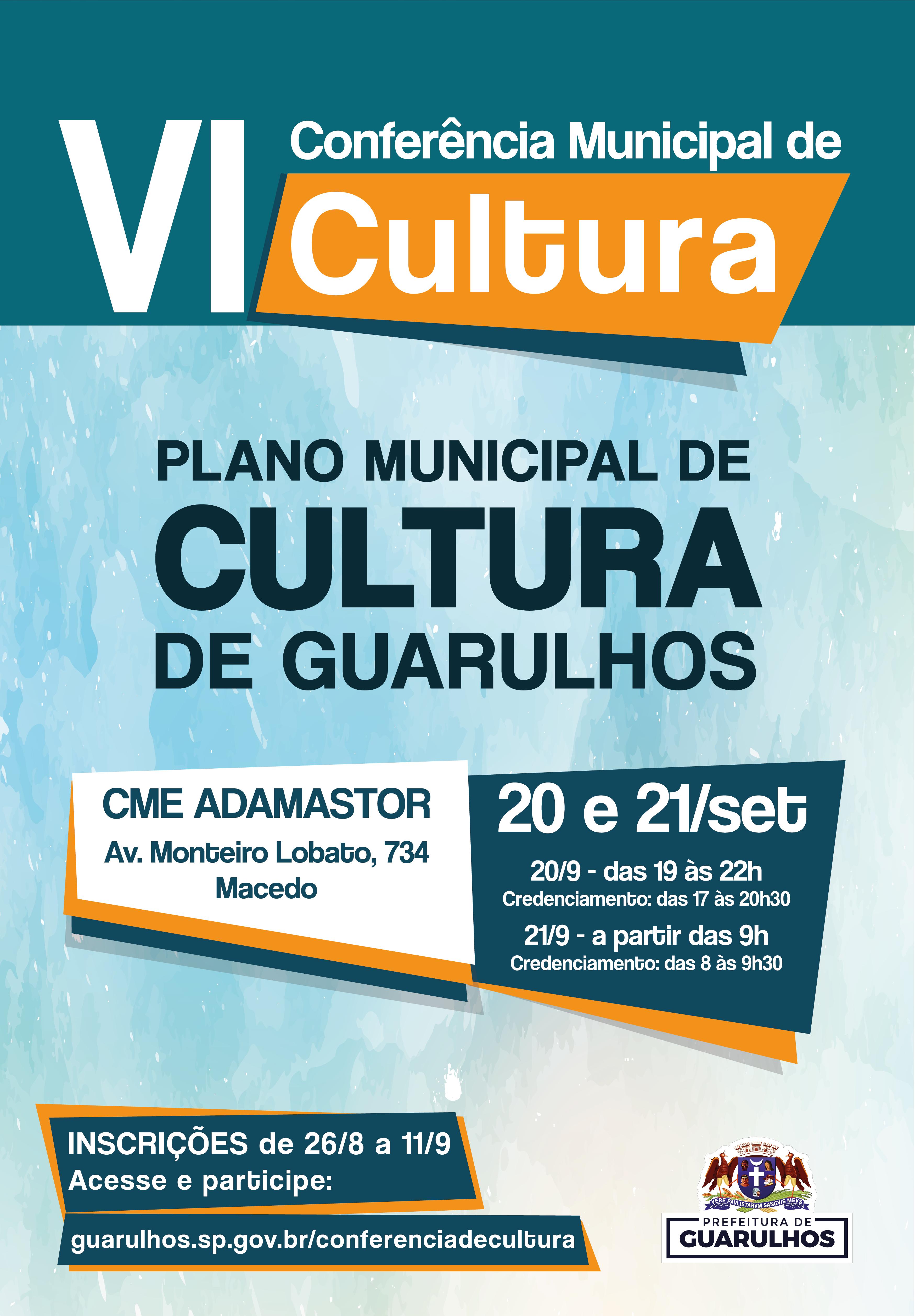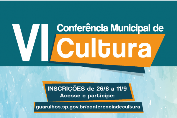 Entre os dias 26 de agosto e 11 de setembro estão abertas as inscrições para a VI Conferência Municipal de Cultura, que terá como tema o Plano Municipal de Cultura de Guarulhos, aprovado pelo Conselho de Política Cultural. A conferência acontece nos dias 20 e 21 de setembro no Adamastor Centro.