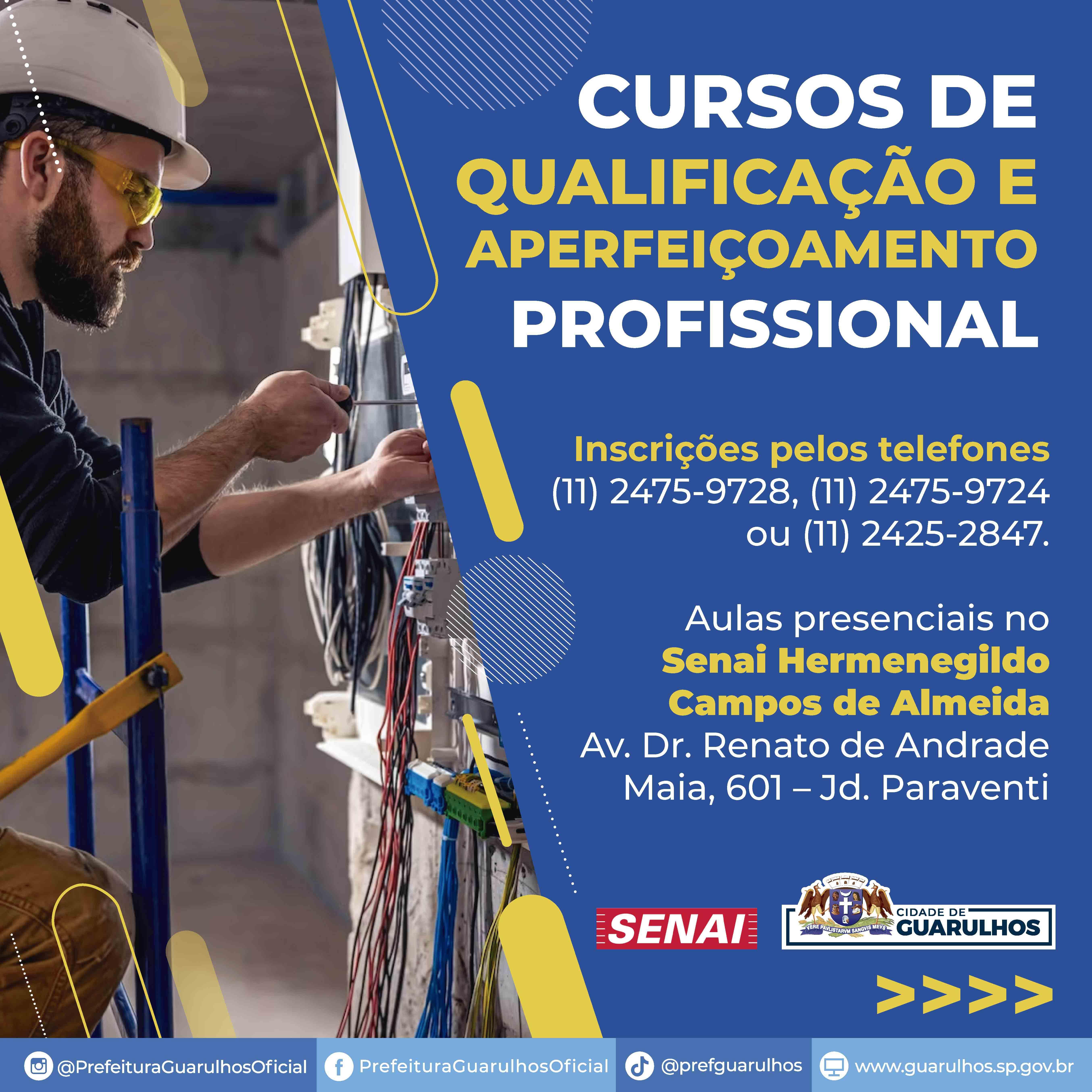 A Prefeitura de Guarulhos abriu, em parceria com o Senai, mais 137 vagas para cursos gratuitos de qualificação e aperfeiçoamento profissional. Divididos em sete turmas, os cursos recebem as inscrições pelos telefones (11) 2475-9728, (11) 2475-9724 ou (11) 2425-2847, da Secretaria do Trabalho.