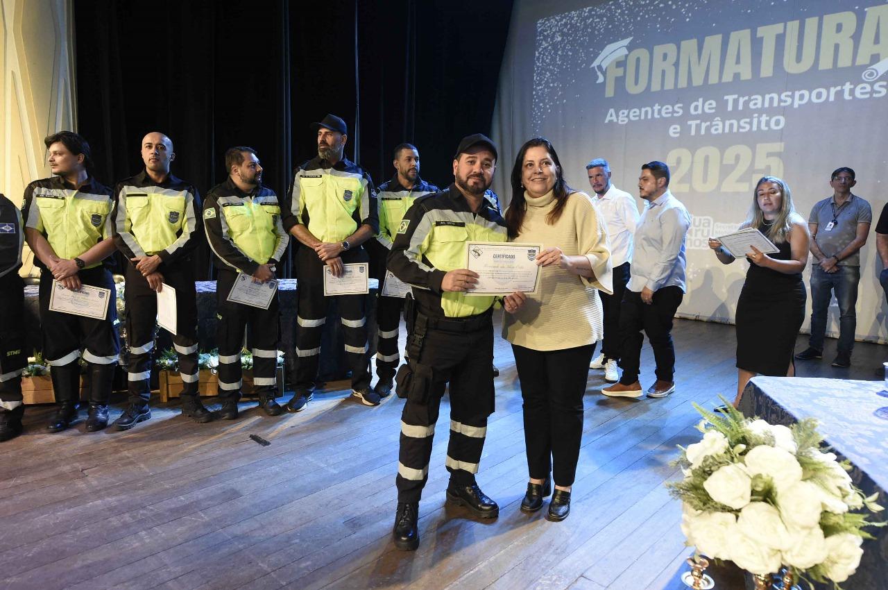 A Prefeitura de Guarulhos, por meio da Secretaria de Mobilidade Urbana (Semob), promoveu na tarde desta segunda-feira (10), no Teatro Padre Bento, a formatura de 27 novos agentes de transporte e trânsito, sendo 24 servidores guarulhenses e outros três de Valinhos, que participaram da formação após convite à administração do município localizado na Região Metropolitana de Campinas.
