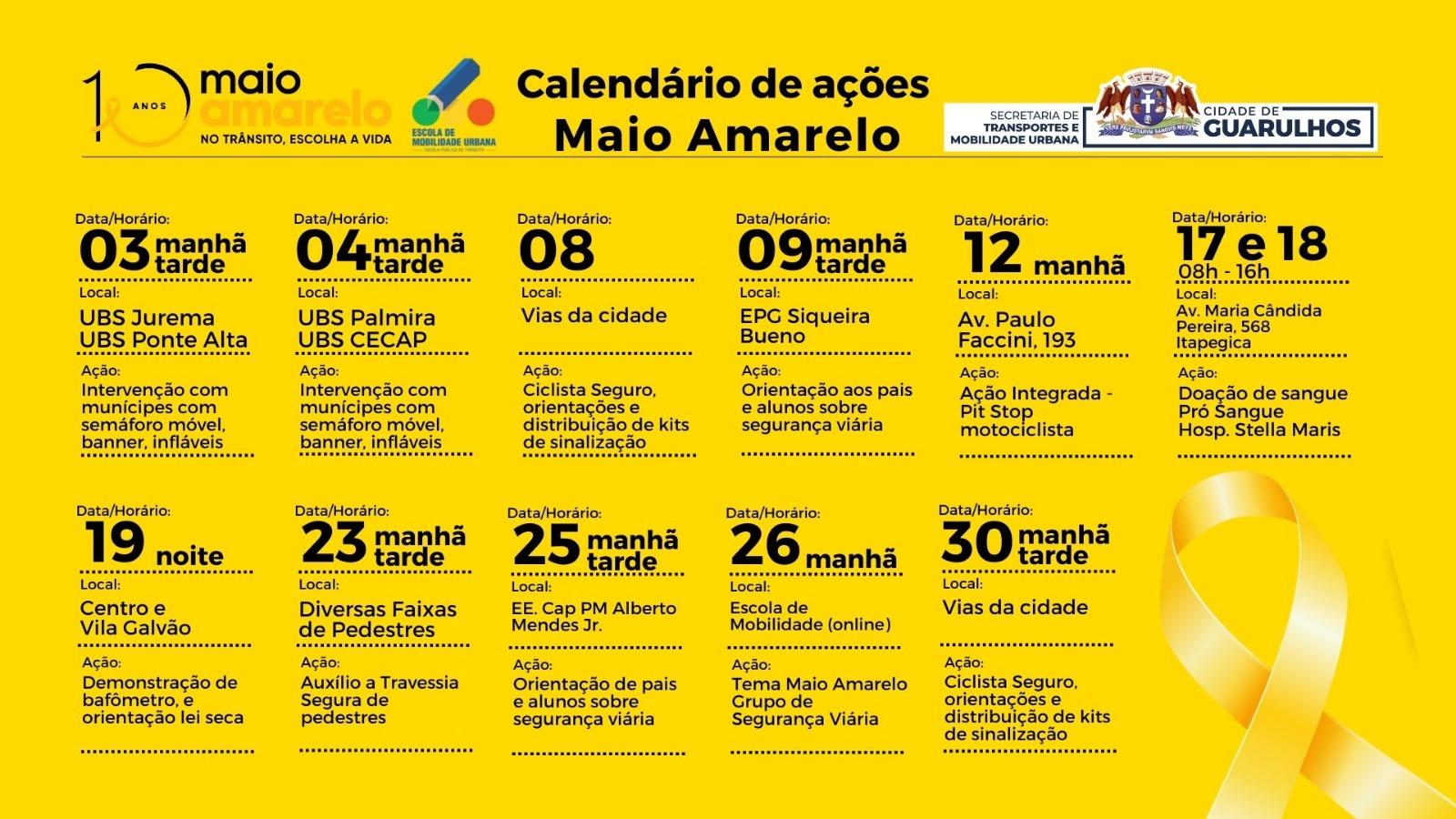 A Prefeitura de Guarulhos irá intensificar as ações do Maio Amarelo em seu site e nas mídias sociais, com adesivos em abrigos de ônibus e por meio da veiculação de mensagens nos painéis digitais informativos localizados em pontos estratégicos do município.