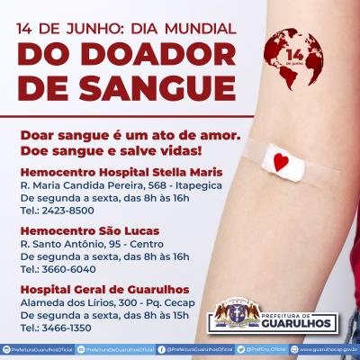 Em alusão ao Dia Mundial do Doador de Sangue, celebrado em 14 de junho, a Prefeitura de Guarulhos lançou a campanha “Doar sangue é um ato de amor: doe sangue e salve vidas”, a fim de conscientizar servidores e munícipes sobre a importância da contribuição aos hemocentros da cidade mesmo em meio à crise sanitária.