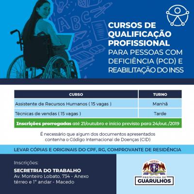 As inscrições para os cursos de assistente de recursos humanos e técnicas de vendas, voltados às pessoas com deficiência e reabilitados INSS (Instituto Nacional do Seguro Social), foram prorrogadas para o próximo dia 21. Os cursos são fruto de uma parceria da Prefeitura de Guarulhos com o governo do Estado de São Paulo.