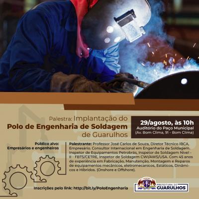 A Prefeitura realizará em 29 de agosto uma palestra para empresários da cidade com o tema “Implantação do polo de engenharia de soldagem de Guarulhos”. O encontro acontecerá no Auditório do Paço Municipal (avenida Bom Clima, 91) às 10h e as inscrições podem ser feitas até as 12h do dia 28 de agosto pelo link http://bit.ly/2TXXjRn.