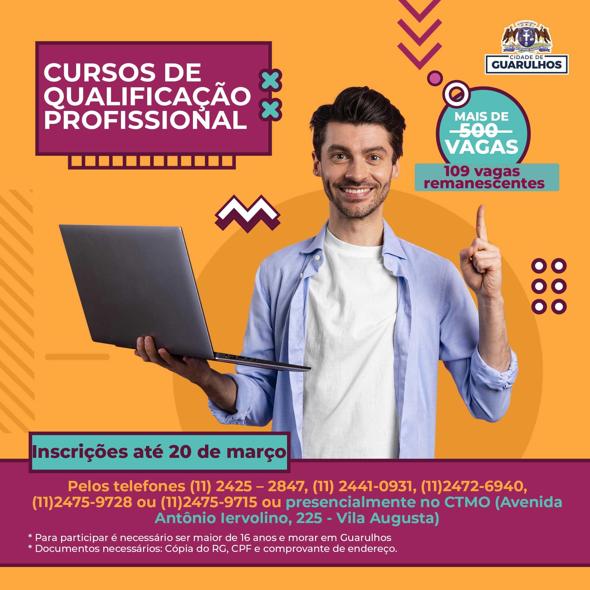 A Prefeitura de Guarulhos mantém abertas as inscrições para as 109 vagas remanescentes em dez cursos gratuitos de qualificação profissional até a próxima segunda-feira (20). Os interessados devem entrar em contato pelos telefones (11) 2425-2847, (11) 2441-0931, (11) 2472-6940, (11) 2475-9728 ou (11) 2475-9715, da Secretaria do Trabalho, ou procurar presencialmente o Centro de Treinamento de Mão de Obra (CTMO) na avenida Antônio Iervolino, 225, Vila Augusta.
