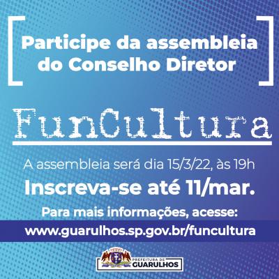 Até o próximo dia 11 de março produtores culturais residentes no município podem se inscrever para a assembleia de eleição de membro do Conselho Diretor do Fundo Municipal de Cultura de Guarulhos, o FunCultura. A manifestação de candidatura ocorrerá durante o encontro somente para os inscritos.