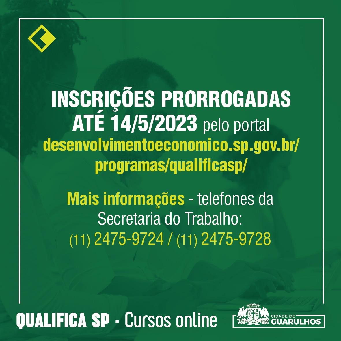 As inscrições para os cursos gratuitos de qualificação profissional do Qualifica-SP foram prorrogadas até o dia 15 de maio. A formação é oferecida pela Prefeitura de Guarulhos, em parceria com o governo estadual, e a oferta é de 123 mil vagas para todo o Estado.