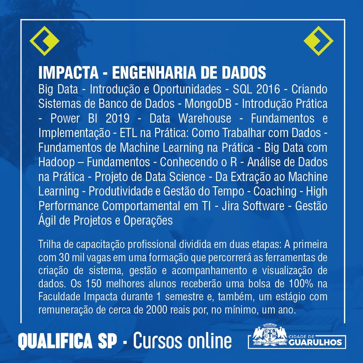 Trilha de capacitação profissional dividida em duas etapas. A primeira com 30 mil vagas em uma formação que percorrerá as ferramentas de criação de sistema, gestão e acompanhamento e visualização de dados. Os 150 melhores alunos receberão uma bolsa de 100% na Faculdade Impacta durante um semestre e, também, um estágio com remuneração de cerca de 2.000 reais por, no mínimo, um ano.