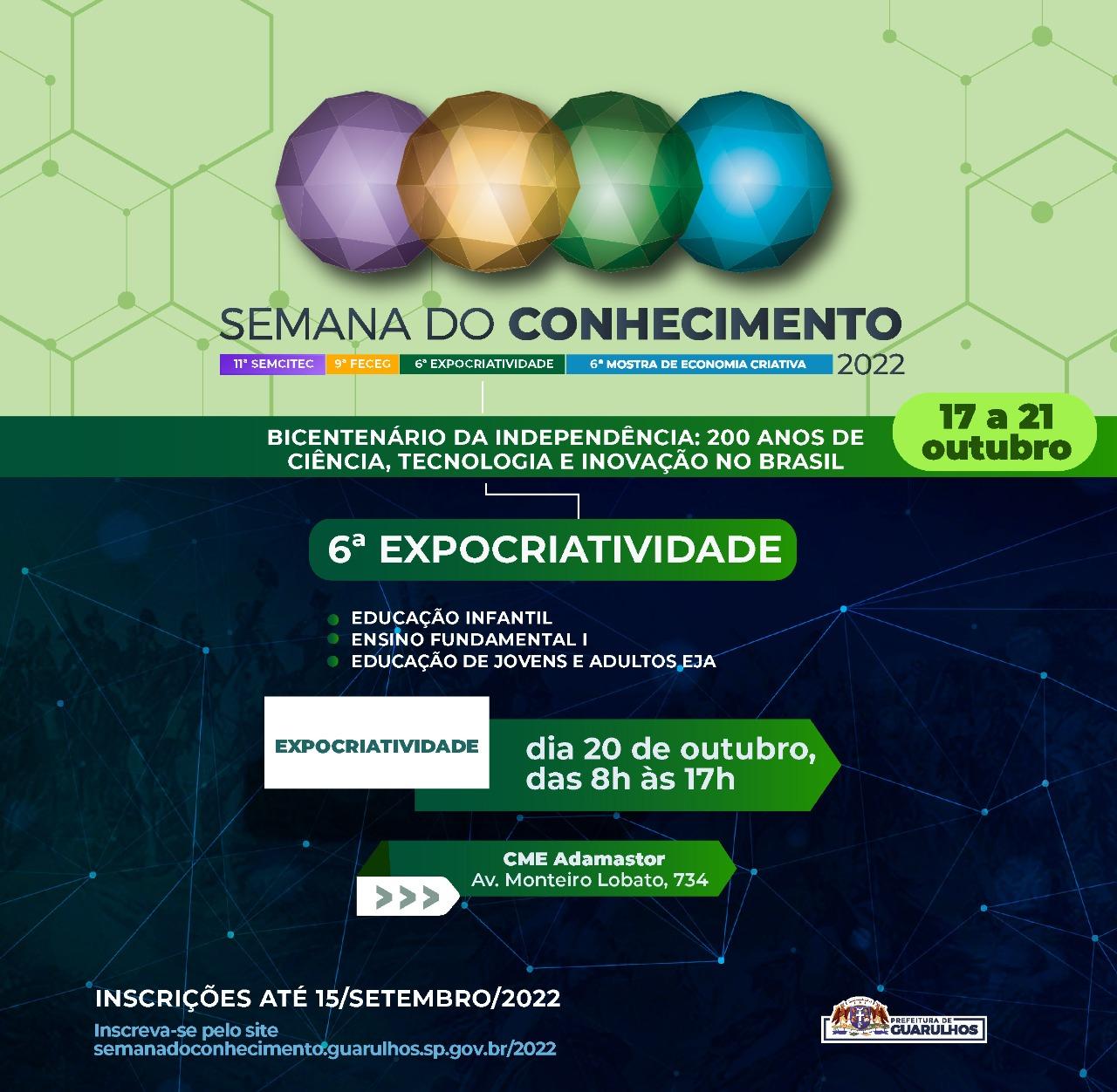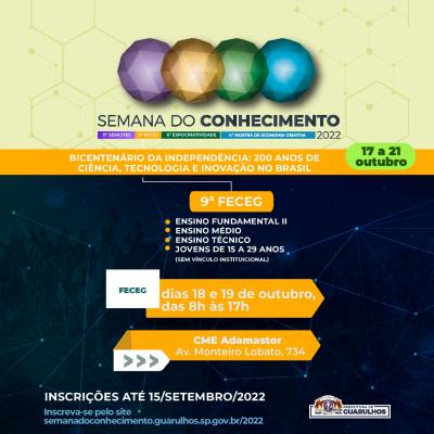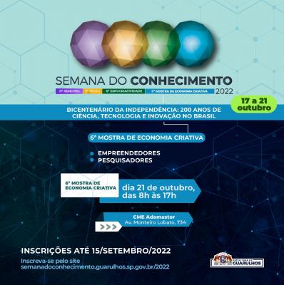 O prazo para a inscrição de projetos na Semana do Conhecimento 2022 foi prorrogado pela Prefeitura de Guarulhos para o próximo dia 15. Os interessados em participar devem submeter seus projetos e conferir o regulamento no site http://semanadoconhecimento.guarulhos.sp.gov.br/.