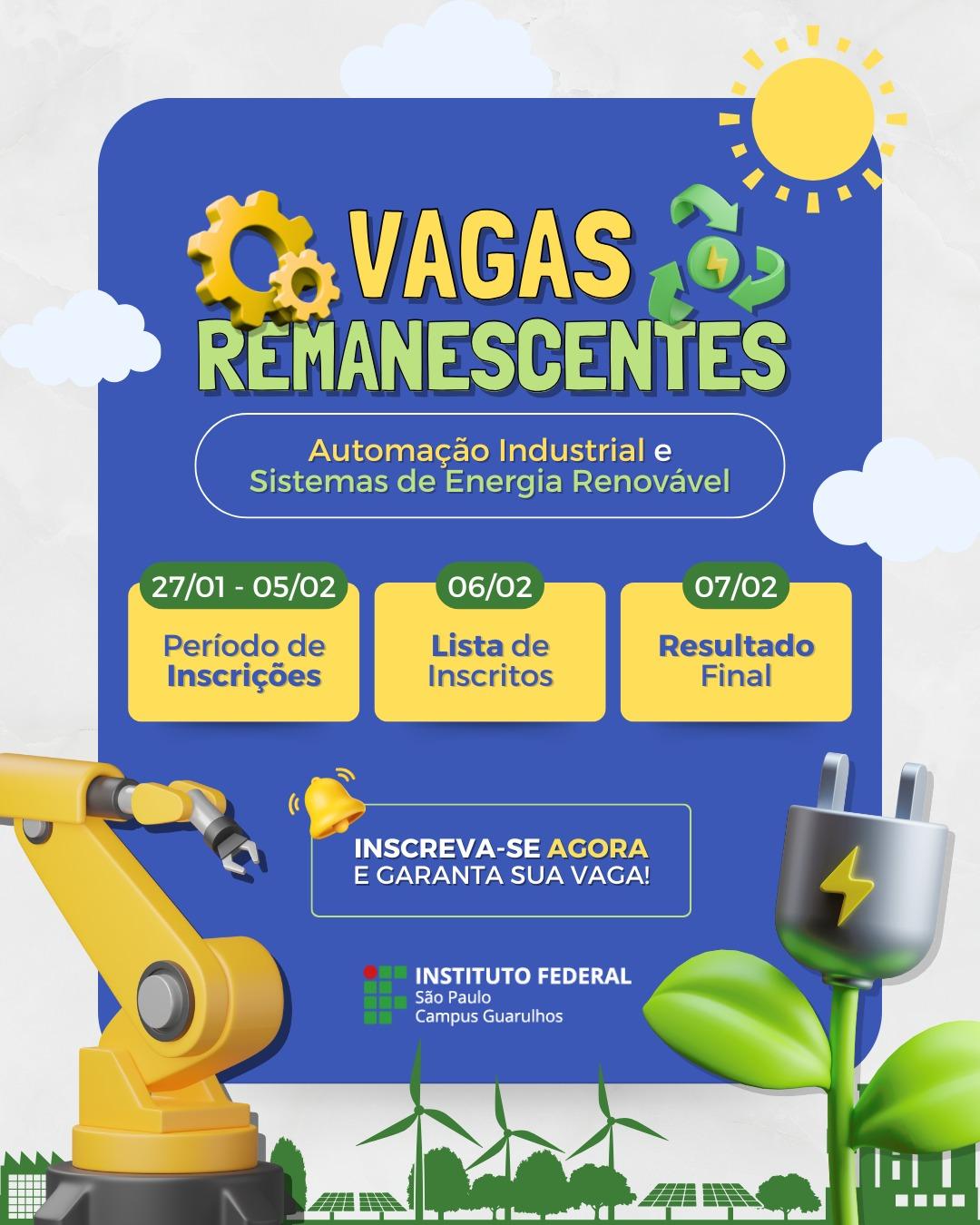 O campus Guarulhos do Instituto Federal de São Paulo divulga vagas remanescentes para os cursos técnico em sistema de energia renovável e técnico em automação industrial, ambos na modalidade presencial. As inscrições ficam abertas até esta quarta-feira (5 de fevereiro) e o processo seletivo destina-se a candidatos que estejam matriculados no 2o ou no 3o ano do ensino médio (curso técnico concomitante) ou que tenham o ensino médio concluído (curso técnico subsequente).