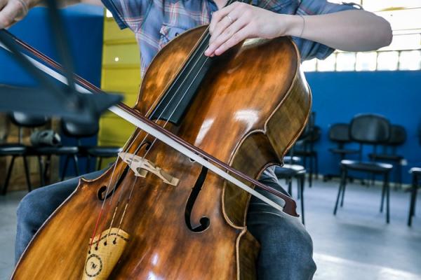 Felipe de Luna, de 29 anos, é aluno do último semestre do curso de bacharel em violoncelo da Faculdade Santa Marcelina e está bastante animado com a atuação dos instrumentistas nas unidades escolares.