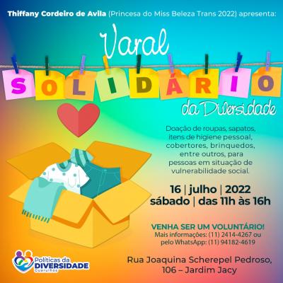 O bairro Jardim Jacy receberá no dia 16 (sábado), das 11h às 16h, o Varal Solidário da Diversidade, que ocorrerá na rua Joaquina Scherepel Pedroso, 106. A ação irá distribuir itens a pessoas em vulnerabilidade social como roupas, sapatos, produtos de higiene pessoal, brinquedos, cobertores, entre outros, os quais estão sendo arrecadados pela Subsecretaria de Políticas da Diversidade (SPD).