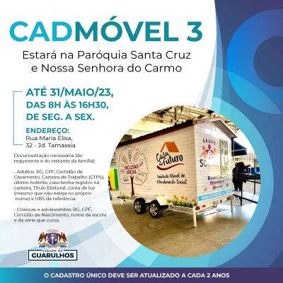 Uma das unidades do CadMóvel passará a atender na paróquia Santa Cruz e Nossa Senhora do Carmo, situada na rua Maria Elisa, 32, Jardim Tamassia, a partir do dia 2 de março. O equipamento da Prefeitura de Guarulhos permanece no local até 31 de maio e atenderá a população de segunda a sexta-feira, das 8h às 16h30.