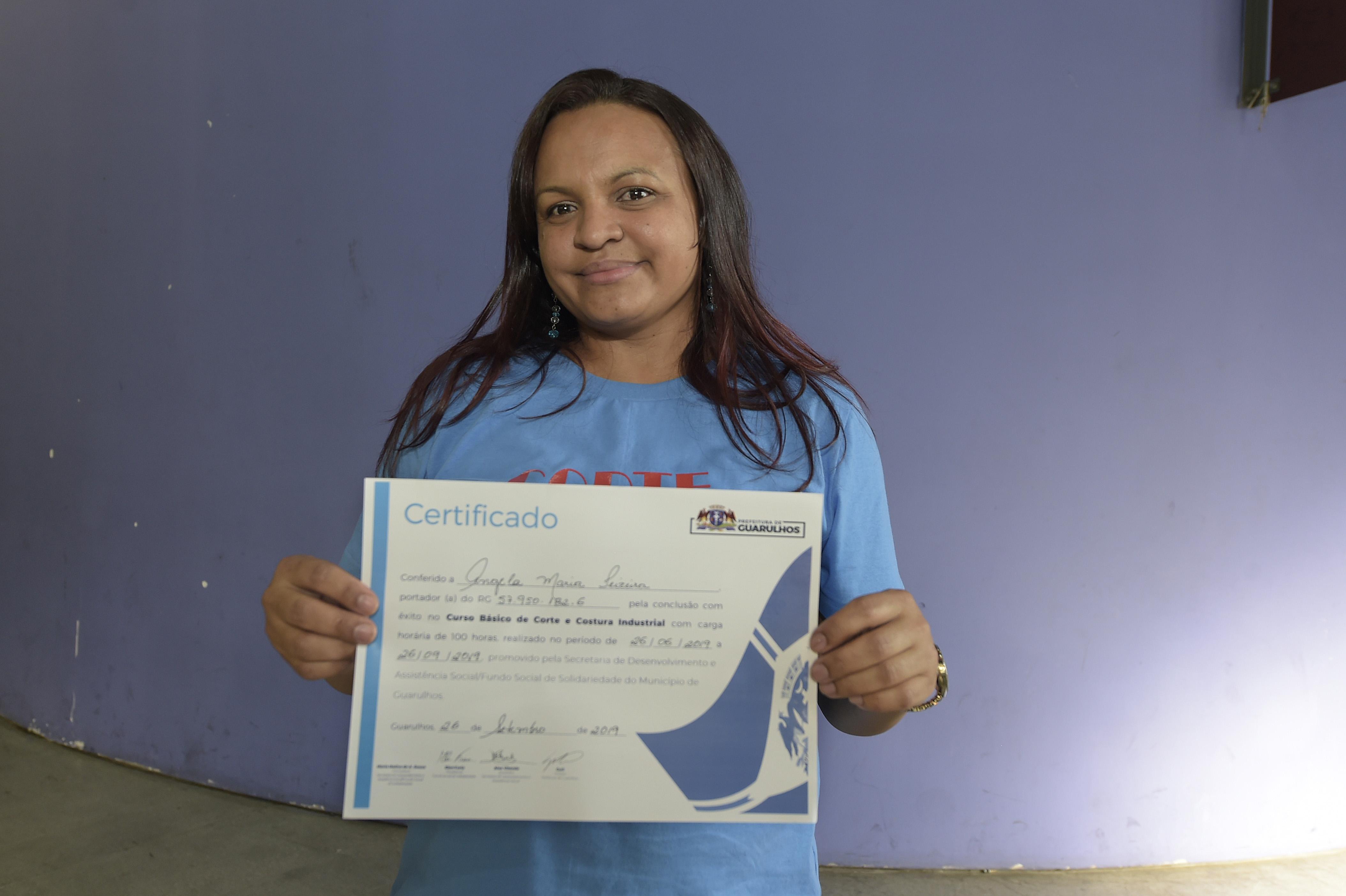 A aluna do curso de corte e costura industrial, Ângela Teixeira, estava desempregada há dois anos e acabou de obter uma colocação em uma confecção. Ela trajava uma camiseta azul que confeccionou na aula, assim como as demais formandas do curso. “Terminei o curso e aprendi muitas coisas. Ontem comecei a trabalhar. Minha chefe elogiou que eu sei trabalhar em todas as máquinas de costura”, disse Ângela, casada, moradora do Jardim Palmira e mãe de duas crianças.
