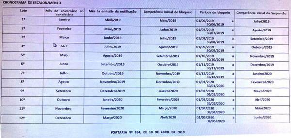 As notificações sobre a data de suspensão do benefício já estão sendo enviadas, conforme a tabela abaixo, sendo que os nascidos em janeiro podem sofrer bloqueio do BPC/LOAS já em junho. Entretanto, a suspensão pode ser revertida junto ao INSS, com a apresentação da documentação necessária o quanto antes.