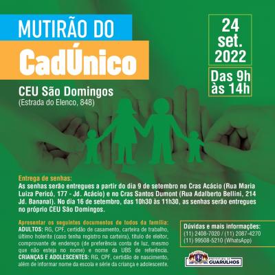 O CEU São Domingos receberá no próximo dia 24 (sábado) o Mutirão do Cadastro Único para Programas Sociais (CadÚnico). No evento, que acontecerá das 9h às 14h, será possível realizar a inscrição no CadÚnico, além de atualizar informações já fornecidas e solicitar benefícios.