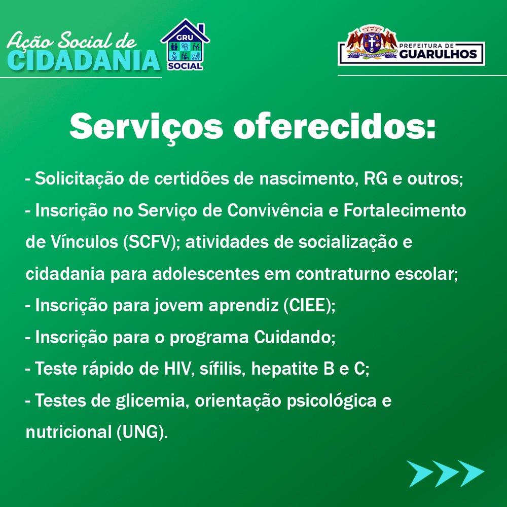 A ação de cidadania GRU Social terá uma nova edição no dia 7 de maio, das 9h às 15h, no Cras Centro (rua Santana do Jacaré, 84, Jardim Bom Clima). O evento, organizado pela Prefeitura de Guarulhos por meio da Secretaria de Desenvolvimento e Assistência Social (SDAS), disponibilizará diversos serviços gratuitos, tanto municipais quanto de parceiros.