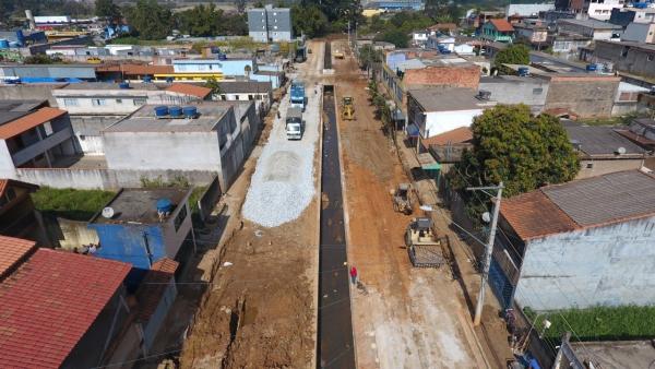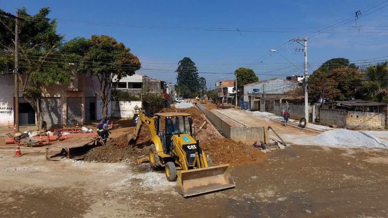 A Prefeitura de Guarulhos executa obras de pavimentação e drenagem na avenida Minas Gerais, ao longo do córrego Iguaçu-Tietê, no Cidade Soberana. As obras foram retomadas no início de março e serão concluídas até o final de outubro.