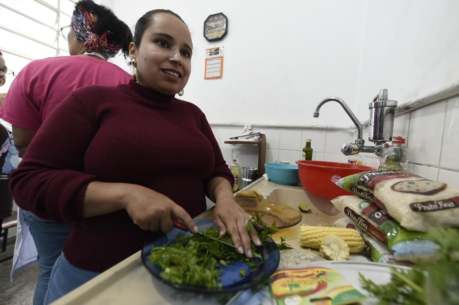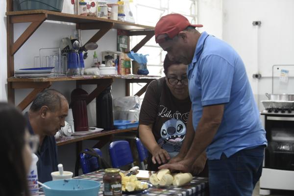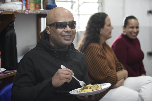 Os integrantes do Peis colaboraram cortando a mandioca, o frango, a o milho e os temperos, como no caso de Camilo Alves Pereira, de 36 anos, que picou a cebola. Ele fez aula de orientação em mobilidade do Peis porque perdeu a visão em razão do glaucoma.