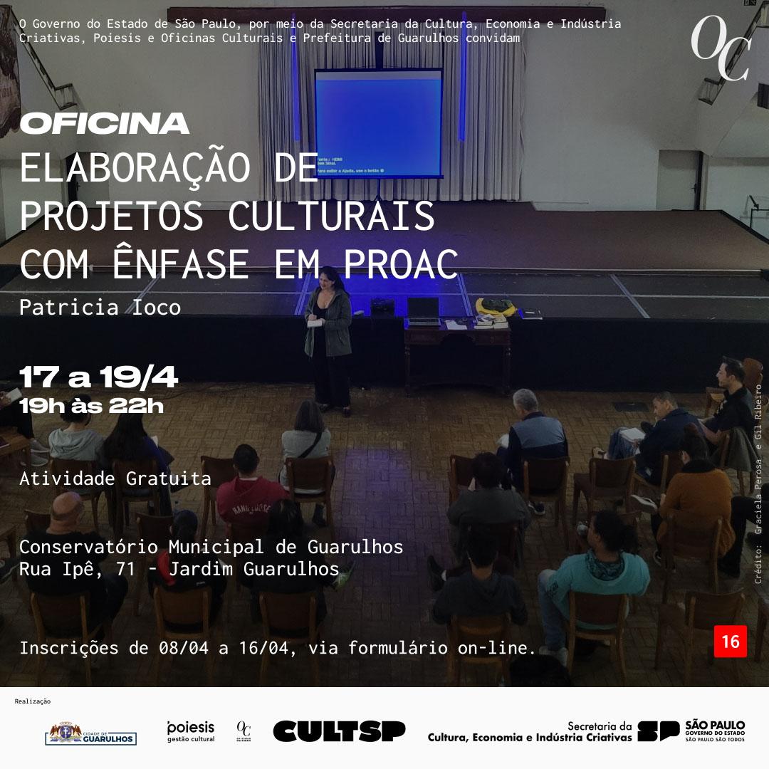 Entre os dias 8 e 16 de abril a Prefeitura de Guarulhos receberá as inscrições para a oficina gratuita de elaboração de projetos culturais com ênfase no Programa de Ação Cultural de São Paulo (ProAC). A atividade, mediada pela consultora Patrícia Ioco, é uma parceria da Secretaria Municipal de Cultura com a Secretaria Estadual de Cultura, Economia e Indústria Criativa.