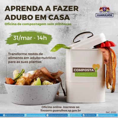 Para participar da oficina é necessário fazer inscrição prévia em https://bit.ly/3IIGfX6. Os inscritos receberão o link de participação até 2 horas antes do início do evento. A atividade é parte da agenda Lixo Zero Guarulhos da Secretaria de Serviços Públicos. Saiba mais em lixozero.guarulhos.sp.gov.br.