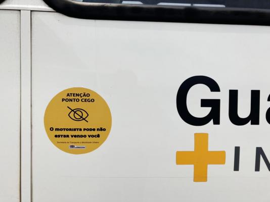 Os ônibus municipais de Guarulhos estão recebendo adesivos de alerta em sua lateral para chamar a atenção dos motociclistas e ciclistas sobre o pontos cegos do motorista. Por um espaço de cerca de quatro metros, a partir do banco do motorista, o condutor do ônibus não enxerga veículos ciclomotores ou bicicletas que estejam trafegando em ambos os lados.