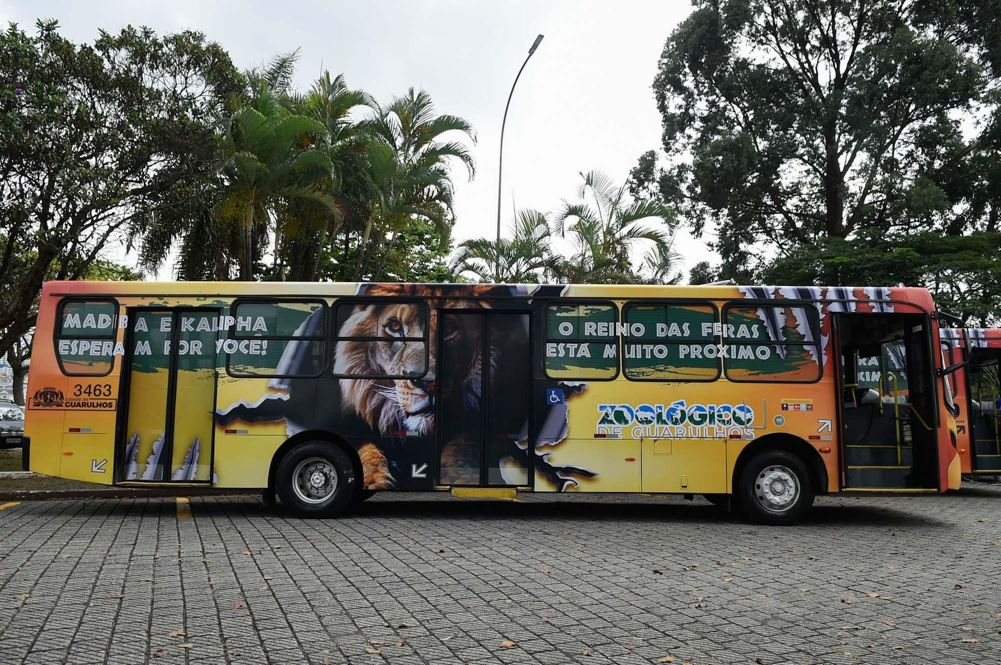 Os leões Madiba e Kalipha e a onça-pintada Tiana são as estrelas dos novos ônibus temáticos que ainda nesta semana começarão a circular pela cidade para divulgar o Zoológico de Guarulhos. Fotos dos grandes felinos que moram no zoo foram adaptadas para envelopar os três veículos que atenderão diferentes linhas a cada semana.