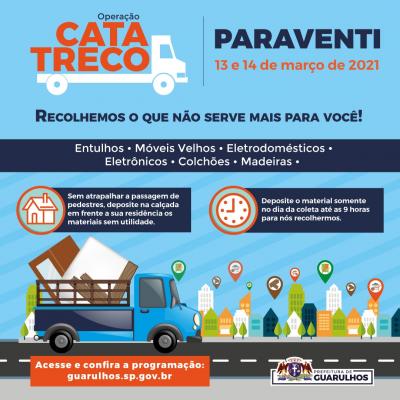 Moradores do Jardim Paraventi poderão se livrar de objetos sem uso de forma correta neste final de semana. No sábado e no domingo, dias 13 e 14, a Prefeitura de Guarulhos realiza no bairro a primeira coleta da operação Cata-Treco. Nos dois dias, moradores devem colocar nas calçadas, até as 9h, os itens que desejam descartar para que sejam recolhidos.