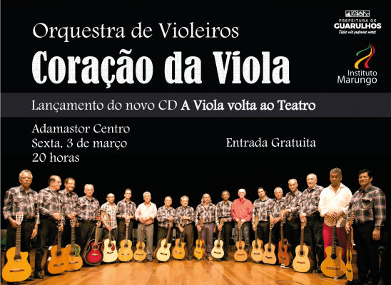 Reviver momentos históricos da música raiz de Guarulhos e do nosso Brasil Caboclo. Essa é a proposta do novo trabalho da Orquestra de Violeiros Coração da Viola, que apresenta o disco A Viola volta ao Teatro, no próximo dia 3 de março, sexta-feira, às 20 horas, no Adamastor Centro.