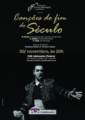 A Prefeitura de Guarulhos apresenta Canções do Fim de Século, espetáculo da Orquestra Jovem Municipal de Guarulhos que acontece no próximo sábado (30), às 20h, no Teatro do Adamastor Centro. O espetáculo conta com a participação do barítono brasileiro Vinícius Atique, cuja renomada carreira é reconhecida internacionalmente. A apresentação tem classificação livre e os ingressos gratuitos devem ser retirados na bilheteria com duas horas de antecedência do espetáculo.
