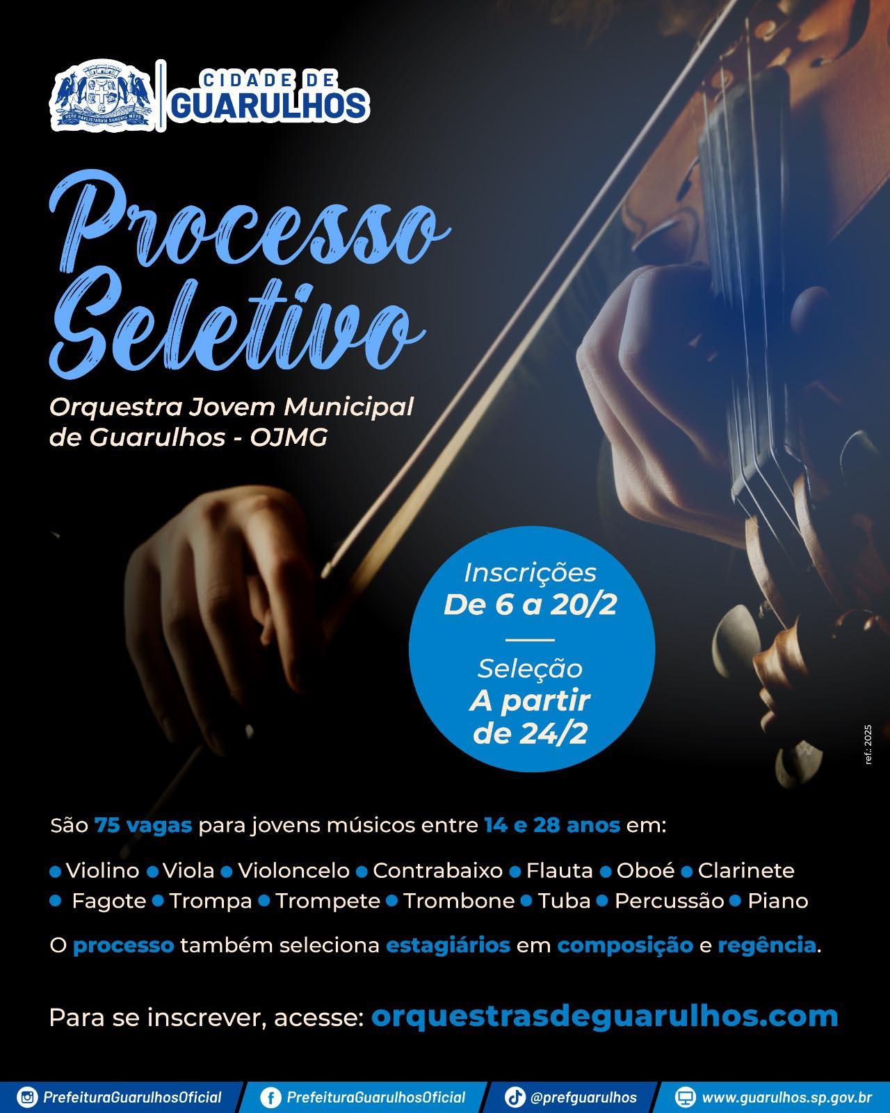 A Prefeitura abre nesta quinta-feira (6) inscrições para bolsistas da Orquestra Jovem Municipal de Guarulhos. As 75 vagas se destinam a jovens entre 14 e 28 anos em fase final de sua formação e que estejam interessados em se tornar músicos profissionais. O período de inscrições se encerra no dia 20 de fevereiro e as provas de seleção deverão acontecer a partir de 24 de fevereiro.