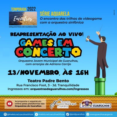 Devido ao grande sucesso de público do Games em Concerto, a Orquestra Jovem Municipal de Guarulhos reapresenta o espetáculo com as mais eletrizantes trilhas sonoras dos jogos de videogame no próximo domingo (13), às 16h, no Teatro Padre Bento. Os ingressos gratuitos para o espetáculo devem ser adquiridos pelo site http://orquestrasdeguarulhos.com/ingressos.
