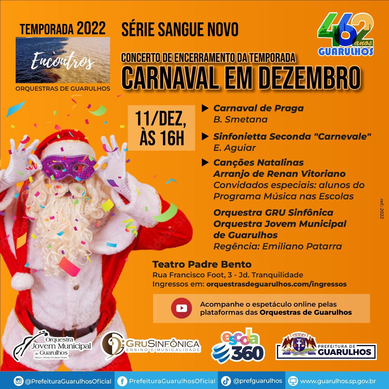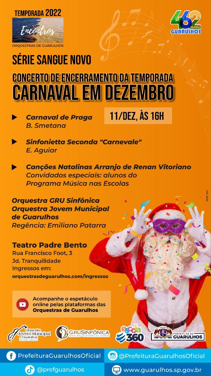 Carnaval em dezembro? Sim, é isso mesmo. No encerramento da temporada 2022 das orquestras de Guarulhos, a Gru Sinfônica e a Orquestra Jovem aproveitam as comemorações do Dia do Samba, celebrado no último dia 2, e apresentam espetáculo com repertório de música brasileira no próximo domingo (11), às 16h, no Teatro Padre Bento. Os ingressos gratuitos para o espetáculo devem ser adquiridos pelo site http://orquestrasdeguarulhos.com/ingressos.