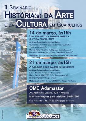 A realização do II Seminário História(s) da Arte e da Cultura em Guarulhos é uma iniciativa da Secretaria de Cultura e do Arquivo Histórico Municipal de Guarulhos e objetiva oferecer encontros temáticos e palestras em espaços públicos da cidade. Para mais informações ligue para 2409-1600, de segunda a sexta-feira, das 9h às 17h. Será fornecido certificado de participação do evento.