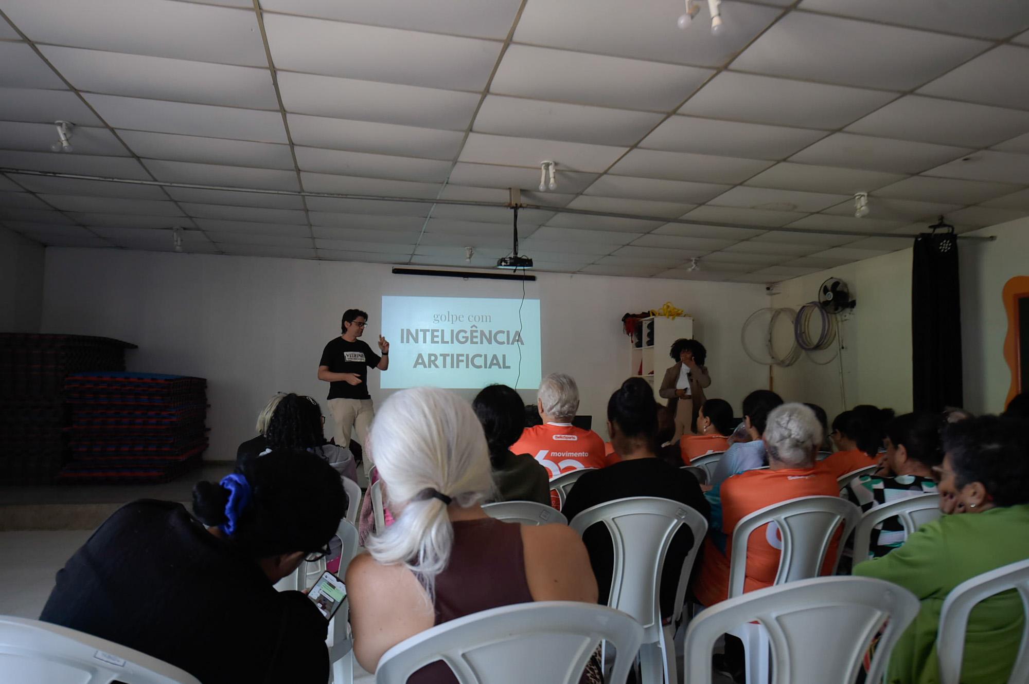 Através de vídeos e dramatização de situações, a apresentação tratou de assuntos como a diferença de fraude e golpe, principais tipos de golpe (WhatsApp, golpes dos links e sites falsos, e até de inteligência artificial), orientações para criar senhas fortes, dicas de como salvar contatos e orientações quando for vítima de golpes pela internet.